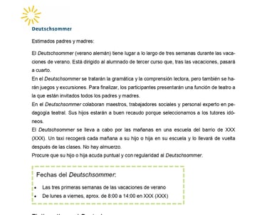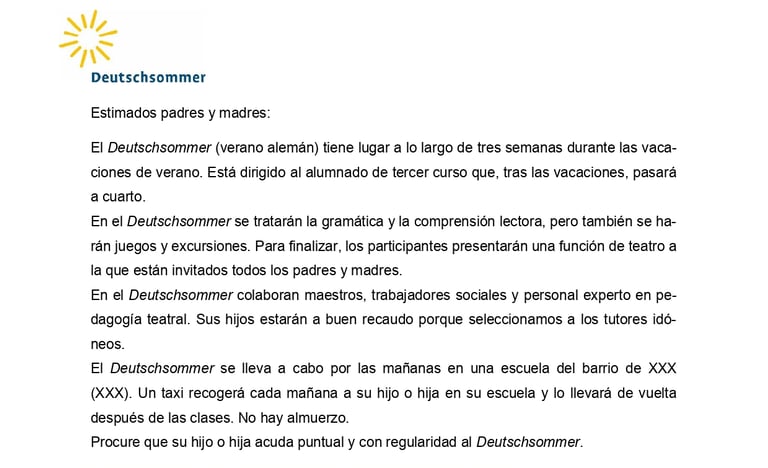 This is an informative paper on a summer camp, addressed at families with primary school children. The translation is aimed at facilitating Spanish-speaking families to understand the details, improving their integration.