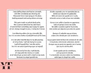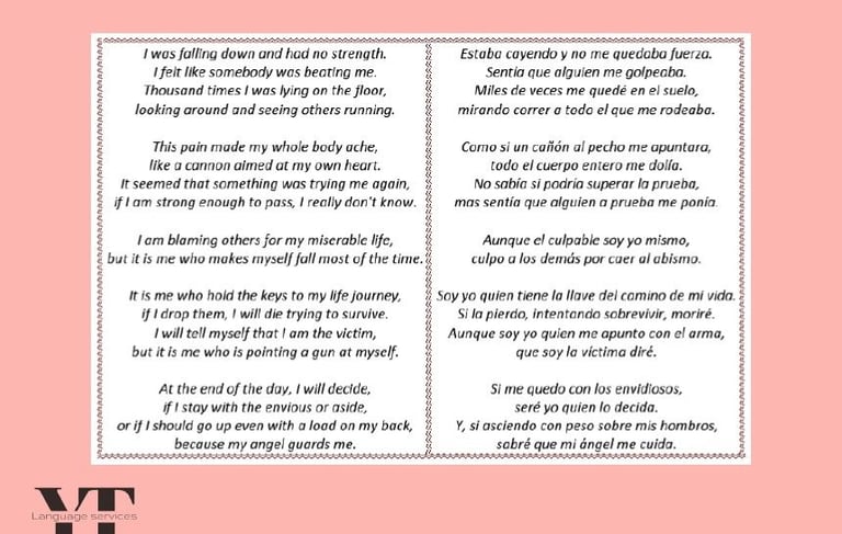 A spiritual book written by Aminah Dobias, already translated into several languages, which I had the pleasure to translate into Spanish. A lot of challenges it offers: poetry, metaphors, and cultural references. You can find, as example, one of the poems with the translated text.